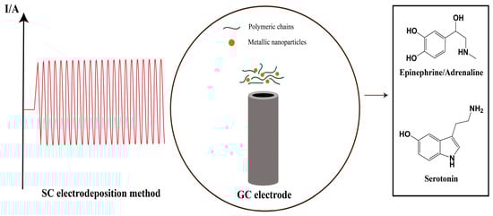 The monitoring of neurotransmitters like dopamine, serotonin, and epinephrine represents a very active research topic in the management of chronic diseases like Alzheimer’s and Parkinson’s. These neurotransmitters play key roles in the functioning of the central nervous system and their abnormal levels are associated with neurological diseases. Consequently, the quantification of the neurotransmitters by various analytical methodologies including optical methods, chromatography, and capillary electrophoresis with low detection limits have been applied [1,2,3,4]. These analytical techniques provide high sensitivity, selectivity, and precise quantification of various neurotransmitters at low concentration levels in real samples with complex compositions. However, these methodologies require expensive and sophisticated experimental setups. As an alternative to these approaches, fast, sensitive, reliable, and cost-effective electrochemical-based techniques have been investigated during the last few years [5,6]. The use of sensing materials based on nanostructured conducting polymers and inorganic metal nanoparticles demonstrates improved analytical performance toward the detection of various neurotransmitters such as serotonin, dopamine, and epinephrine [7]. The synthesis of nanostructured composite materials composed of organic conducting polymers and metal nanoparticles could be achieved by chemical and/or electrochemical routes. The electrochemical route ensures better control of the thickness of the electrodeposited sensing materials and provides a fast and versatile approach for metal nanoparticle synthesis. The conducting polymer matrix provides a favorable microenvironment for the in situ preparation of metallic nanoparticles (MeNPs) such as Pt, Au, and Ag, to name but a few. In addition, the organic polymeric matrix improves the selectivity of the analytical measurements, while the metallic nanoparticles increase the sensitivity thanks to their catalytic activity. This approach has demonstrated several benefits like high sensitivity, fast analysis time, reliability, and selectivity in the electrochemical sensing of various neurotransmitters [8,9,10,11,12]. In a recent study, a serotonin-sensitive electrochemical sensor based on polypyrrole (PPy) and AuNPs has been developed [13]. The sensing composite material has been synthesized in two steps. Firstly, the electropolymerization of the pyrrole monomer onto graphite-based screen-printed electrode was achieved via multipulse amperometry. Afterward, the AuNPs were electrogenerated by a potentiodynamic method in an aqueous solution containing the metallic precursor. The PPy-AuNPs composite materials displayed increased sensitivity and a low detection limit. The improved overall analytical performance was due to the increase in the electroactive surface area provided by the PPy matrix and the catalytic effects brought by AuNPs. The proposed electrochemical sensor was successfully employed in the quantification of serotonin in serum samples. In another study, an electrochemical sensor based on the conducting polymer polyaniline (PANI) and Au nanoparticles (AuNPs) for dopamine (DA) detection has been developed [14]. The electrodeposition of AuNPs has been achieved by potential cycling onto the PANI layer. The electrochemical sensor has been successfully applied in dopamine determination with a linear range of 1–100 μM and a detection limit of 0.86 μM DA.