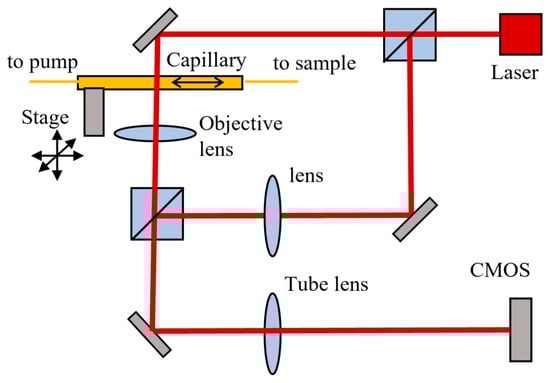 DHM Setup: laser beam (red) is split in two and recombined by two cube beam splitters, which are being directed to the CMOS; the urine is flowing in the capillary and imaged by the objective lens and tube lens on CMOS.