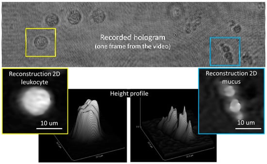 Example of recorded hologram (top image) and reconstructed phase images of a leukocyte (bottom-left yellow inset) and mucus (bottom-right blue inset) with their respective height profiles.