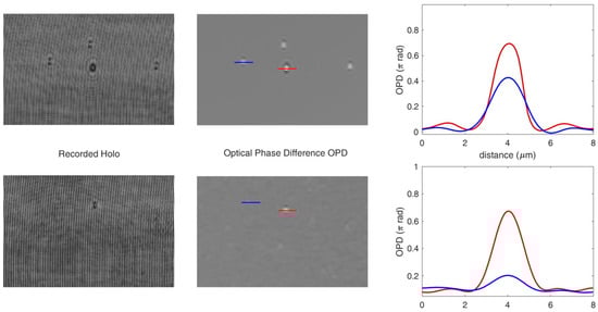 Optical phase difference (OPD) functions reconstructed numerically from recorded holograms of silica (blue) and polystyrene (red) microbeads: 2 μm polystyrene and 2 μm silica beads (top); 2 μm polystyrene and 1 μm silica beads (down).