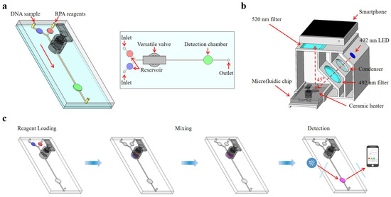 Schematic diagram of the microfluidic biosensing system for Salmonella detection. (a) The schematic diagram of the microfluidic chip. (b) The structure of the real-time fluorescence detection system. (c) The whole procedure for Salmonella detection.