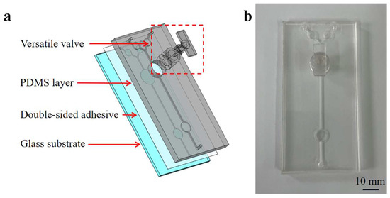 A microfluidic chip incorporating a versatile valve was developed to integrate mixing, RPA reactions, and detection. Figure 2 illustrates the components of the microfluidic chip, which include: (1) a glass substrate; (2) the PDMS layer (100 mm long × 50 mm wide × 5 mm high) containing two inlets, one outlet, two reservoirs (25 µL volume), one detection chamber (50 µL volume), and one channel (0.8 mm wide × 1 mm high) structure; (3) 3D-printed versatile valve components (designed with a convex and concave aligned structure and two magnetic bars) were used for on-demand mixing and controlling the flow of the fluid. The circular mixing chamber at the bottom of the valve can hold up to 50 µL of reagents.