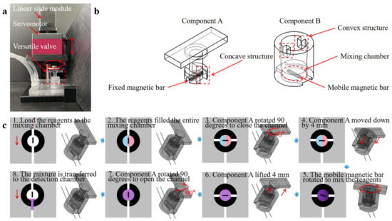 As shown in Figure 3a, the versatile valve comprises two parts: a rotational mixing part (Component A) and a valve part (Component B). Figure 3b showcases a detailed valve design scheme. Component A is used for magnetic actuation mixing and valve control, with a magnetic bar fixed at its base. It is designed with a concave structure to mesh with the convex Component B, thereby driving valve rotation and regulating the flow. Component B also serves as a mixing chamber, with a mobile magnetic mixing bar placed within. The versatile valve system incorporates a microcontroller unit (MCU) controller, drive module, power module, linear slide module, and a servomotor. Figure 3c and Video S1 demonstrate the versatile valve’s workflow as follows: Component A and Component B are connected through the concave–convex alignment structure in the initial state. (1) load the reagents into the mixing chamber through the opening of Component B; (2) after the reagents fill the entire mixing chamber; (3) Component A drives Component B to rotate 90° to seal the chamber as a valve; (4) Component A descends by 4 mm to disengage from the concave–convex alignment structure and rotates at a speed of 360° per second; (5) the mobile magnetic bar rotates to mix the reagents owing to the magnetic torque of the fixed magnetic bar in Component A.