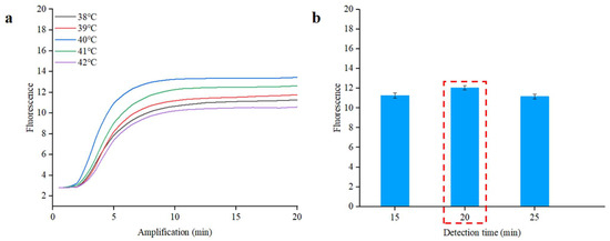 To establish optimal conditions for the RPA reaction, we conducted a series of tests using S. typhimurium DNA at a concentration of 1.0 × 105 copies/µL in the qPCR instrument. The reaction temperature significantly influences the reaction efficiency. To find the optimal temperature, we tested a range of temperatures from 38 °C to 42 °C for the RPA reaction. As illustrated in Figure 5a, the Cp value at 40 °C is 2.5, which is lower than the values noted at other temperatures. Choosing an appropriate reaction time enhances the detection process’s efficiency. In order to optimize the RPA detection time, different reaction times (from 15 to 25 min) were applied to the RPA reaction. As demonstrated in Figure 5b, no notable differences were noted in Cp values corresponding to different reaction times, but the highest fluorescence intensity was achieved at 20 min [40]. The real-time fluorescence curves of different reaction times are shown in Figure S7. Simultaneously, a complete amplification curve was observed within the initial 20 min. The results suggested that optimal amplification can be achieved at 40 °C for 20 min.