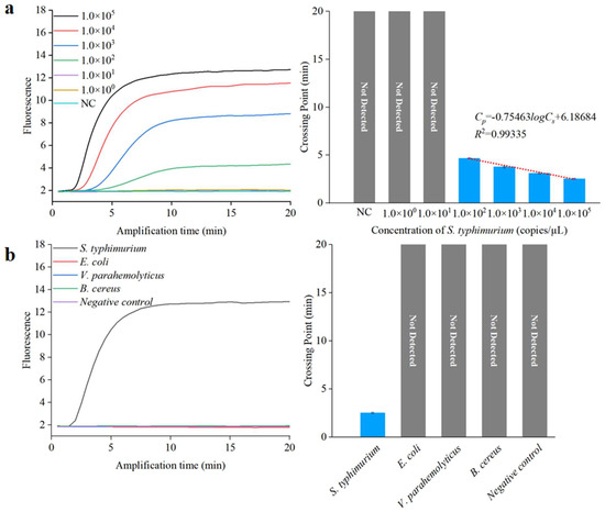 To achieve sensitive and specific detection of Salmonella, we assessed the analytical sensitivity and specificity of the RPA assay for S. typhimurium. We used 10-fold serial dilutions of S. typhimurium DNA to evaluate the detection limit. A standard curve for the RPA reactions was derived by plotting the Cp value against the log 10 DNA copy number, as depicted in Figure 6a. The correlation coefficient and detection limit of the RPA method were 0.99 and 1.0 × 102 copies/µL, respectively, indicating the RPA method could be employed for quantitative analysis. To demonstrate the specificity of the RPA method, three different non-target bacteria at a concentration of 1.0 × 105 copies/µL, including E. coli, V. parahemolyticus, and B. cereus, were tested using this method. The results, shown in Figure 6b, indicate that only the target S. typhimurium yielded a fluorescent signal after amplification, signifying excellent sensitivity and specificity.
