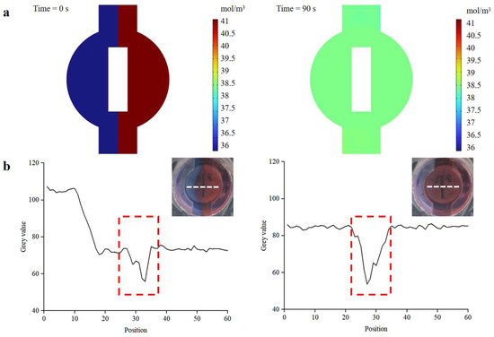 Mixing efficiency of the magnetic actuation mixer. (a) COMSOL simulation result of the mixer. (b) Images of the mixture before and after mixing. Mixing efficiency is analyzed using the gray value analysis method. The white dotted line in the insets is represented as the pixel point selected for gray value analysis. The red dotted line indicates the magnetic bar.