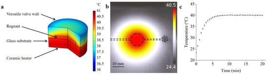 (a) The COMSOL simulation result of the temperature-constant state. (b) Thermal infrared image of the microfluidic chip. (c) The temperature variation of the reagents in the detection chamber.