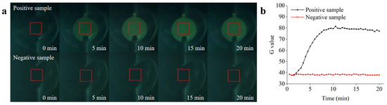 Experiments to determine the Salmonella detection performance of the microfluidic biosensing system were conducted under optimized conditions. The ceramic heater was preheated to achieve the optimal reaction temperature for the RPA. The reaction reagents were automatically transferred to the detection chamber immediately after sufficient mixing to initiate real-time RPA detection. To verify the performance of the microfluidic biosensing system, the positive sample (1.0 × 105 copies/µL) and the negative control sample (containing all the reaction materials except target DNA) were detected. The acquisition setting parameters in the app were as follows: the acquisition interval and number of acquisitions of fluorescence images were set to 30 s and 40 s, respectively, and the rectangular ROI size was set to 12. As shown in Figure 9a, the fluorescence intensity first increased and then remained constant as the reaction progressed, which could be visualized by the naked eye (from the images acquired by the app) and quantified by the fluorescence detection system. No significant changes in the fluorescence intensity were observed in the negative sample. As shown in Figure 9b, an amplification curve for the positive sample was observed within 20 min, whereas no obvious fluorescence signals were observed for the negative control. These results are in general agreement with the real-time RPA analysis of the qPCR instrument, verifying the good detection ability of the microfluidic biosensing system.