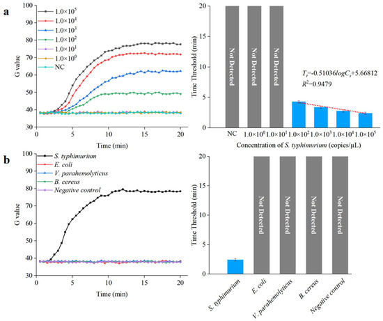To demonstrate the specificity of this integrated microfluidic biosensing system, the target bacteria (S. typhimurium) and the non-target bacteria (E. coli, V. parahemolyticus, and B. cereus) at a concentration of 1.0 × 105 copies/µL were detected under the optimal conditions. As shown in Figure 10b, the target S. typhimurium was observed after amplification, verifying that this integrated microfluidic biosensing system had good specificity.