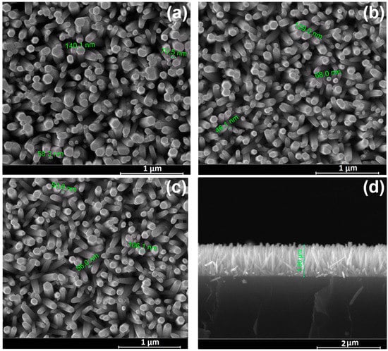 The SEM images show that the freshly prepared and processed samples consist of ZnO nanowires with a hexagonal cross-section, presenting a flat end and a diameter of 50–100 nm, oriented perpendicular to the substrate’s surface (Figure 1d). The layer thickness for all samples was about 1 µm. It can be seen from the figures that the morphology of the ZnO nanowires did not change after heat treatment (Figure 1b) subsequent H-plasma treatment (Figure 1c).