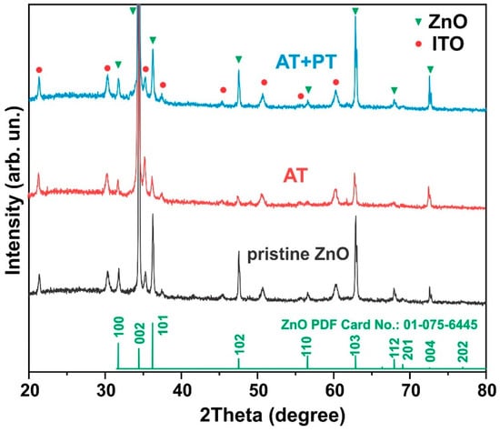 XRD patterns of ZnO nanowire arrays (pristine ZnO, AT, and AT+PT samples) on ITO substrates.
