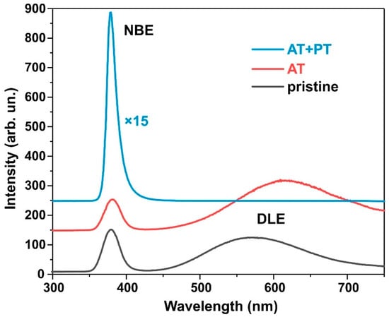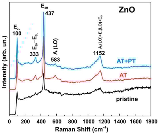 Raman spectra were measured for all three sample types (pristine ZnO, AT and, AT+PT samples) (Figure 3). As shown in the presented spectra, the E2L mode was observed at 100 cm−1. This mode is characteristic of the Raman spectra of ZnO and is associated with the motion of the oxygen and zinc sublattice in the wurtzite structure of the oxide. The E2H mode observed at 437 cm−1 has a high intensity in the Raman spectrum, which confirms the high crystallinity of the samples. In addition, we can also observe another optical phonon mode near symmetry A1 located at 333 cm−1, which corresponds to a vibrational mode (E2H–E2L) [47]. The A1(LO) mode was observed at 583 cm−1. The broad peak at 1152 cm−1 can be ascribed to the occurrence of a multiphonon process (A1(LO) + E1(LO) + E2L) [48].