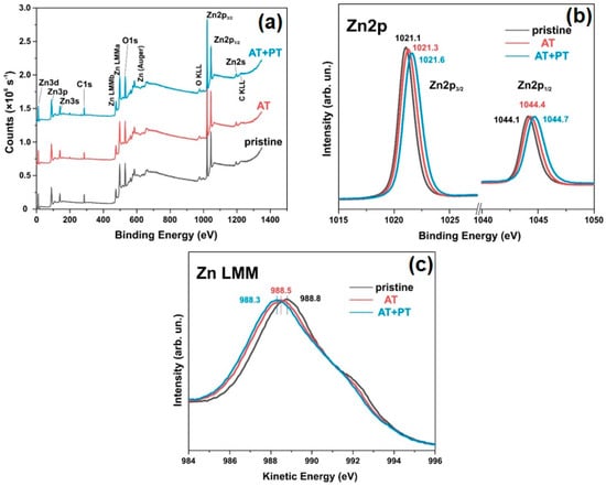 XPS spectra of pristine ZnO, AT, and AT+PT samples: (a) Overall XPS survey spectra; (b) Zn2p1/2 and 2p3/2 core-level scans; (c) Zn LMM Auger spectra.