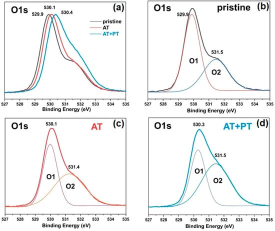 XPS spectra of pristine ZnO, AT, and AT+PT samples: (a) XPS core-level scan of O1s; (b–d) deconvolution of XPS core-level scan of O1s spectra of pristine ZnO NW, AT, and AT+PT samples, respectively. Gaussian’s lines Q1 and Q2 demonstrate the composition into individual components.