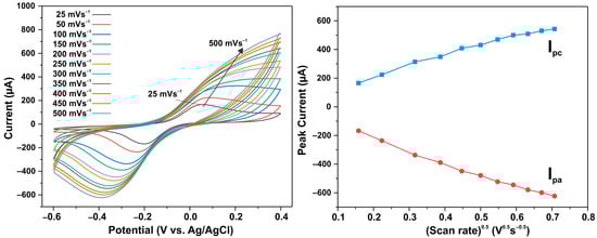 An electrochemical non-enzymatic determination of ascorbic acid (AA) was carried out, for which ZnO NW arrays grown on a conductive ITO layer were used as a working electrode. In order to elucidate the mechanism of AA’s reaction with the electrode surface, the variation in the AA oxidation current peaks on the ITO/ZnO electrode was analyzed at different scanning speeds ranging from 25 to 500 mV/s. Figure 7a presents cyclic voltammetry diagrams showing the effect of different scanning rates of 25–500 mV/s on the electrochemical response of the electrode with the pristine ZnO NW sample in a 0.1 M buffer solution with 0.1 mM of AA. Obviously, the anodic and cathodic peak potentials shift to the positive and negative sides, respectively, when the scanning speed increases, which is a sign of AA’s diffusion mechanism acting on the ITO/ZnO electrode surface. At ~0.2 V, maximal oxidation currents are observed, while at ~−0.4 V, maximal reduction currents are observed. A linear dependence of the peaks of the oxidation currents Ipc and reduction currents Ipa on the square root of the scanning speed was observed, which also indicates a diffusion mechanism consisting of AA’s reaction with the electrode surface.
