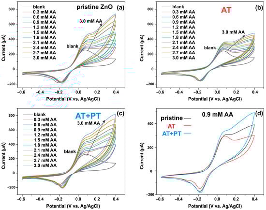 CV response of ZnO NW/ITO electrode vs. AA concentration: (a) pristine ZnO sample; (b) AT sample; (c) AT+PT sample; (d) CV curves of pristine ZnO, AT, and AT+PT samples at AA concentration of 0.9 mM.