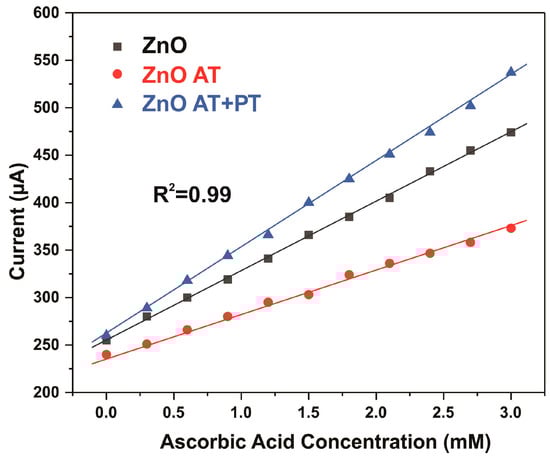 Figure 8a–c show cyclic voltammetry diagrams for the three types of synthesized ZnO NW samples at different AA concentrations ((0.3 ÷ 3) mM) in PBS buffer solution at a scan rate of 25 mV/s. It can be seen that by adding AA, the current response of the ZnO NW/ITO electrode enhances the redox reaction of AA with the analyte. Figure 8d shows the CV curves of the pristine ZnO, AT, and AT+PT samples at an AA concentration of 0.9 mM to compare the sensitivity of the samples. The calibration plot for the ZnO NW/ITO samples is plotted for the oxidation current peaks as a function of AA concentration (Figure 9).