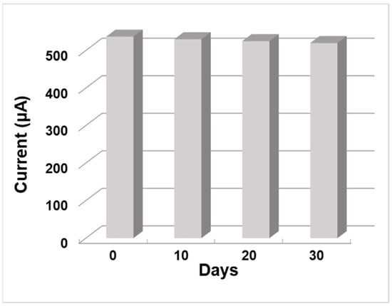 The stability of ZnO NW (AT+PT)/ITO electrode current response in 3 mM AA solution over 30 days.