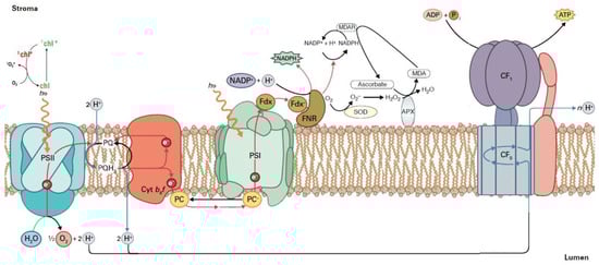 Absorption of light energy from sunlight and its conversion to chemical energy. Electrons are transferred from PSII to PSI and finally to ferredoxin (Fdx) to form NADPH. Under excess light energy, 1O2 is formed via 3chl*. At PSII in the water-splitting complex, the oxidation of water results in molecular oxygen (O2), protons (H+), and electrons (e−). The e− are transferred from H2O to NADP+, and associated with this electron transfer, a proton gradient is established that is used for ATP synthesis by ATP synthase. Plastoquinone (PQ) accepts two electrons from H2O oxidation and two protons (H+) from the stroma of the chloroplast and is reduced to plastoquinol (PQH2), while the e− are transferred to PSI through cytochrome b6f and plastocyanin (PC). A proton gradient from this electron transport is established that results in ATP synthesis. Ferredoxin-NADP+ reductase (FNR) and Fdx are also depicted. When NADP+ is not present (due to unused NADPH for carbohydrate synthesis), the superoxide anion (O2•−) is formed from the electrons that are transferred to O2. Successively, O2•− is converted to hydrogen peroxide (H2O2) by the superoxide dismutase (SOD), and then H2O2 is reduced to water by ascorbate peroxidase (APX). The oxidized ascorbate is reduced from NADPH through monodehydroascorbate reductase (MDAR); as a consequence, NADP+ is available (adopted from [32]).