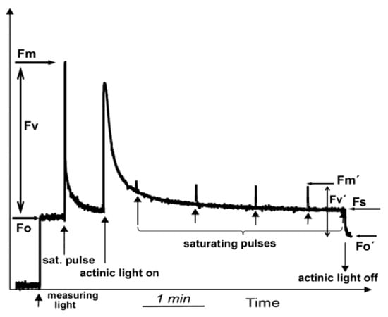 Chlorophyll a fluorescence can be detected using various methods, such as the pulse amplitude modulation (PAM) method. Before starting the measurements, the leaf has to be dark-adapted for several minutes, which depends on the light intensity to which the leaf was exposed before measurement and the plant species. The minimal level of chlorophyll a fluorescence (Fo) in the dark (Figure 3) is measured by a low light intensity, called measuring light (ML), while the maximum yield of fluorescence in the dark (Fm) is evaluated with a saturating light pulse. Under actinic light (AL) illumination, which is the applied light intensity, the maximum fluorescence in the light-adapted state (Fm′) can be estimated with another saturating pulse (Figure 3). The steady-state level of fluorescence in the light (Fs) is measured immediately before switching off the chosen AL intensity (Figure 3). After switching off the AL, the minimal level of chlorophyll fluorescence in the light (Fo′) is measured (Figure 3). The difference between Fm′ and Fo′ is the variable fluorescence in the light (Fv′) (Figure 3). From these measured basic chlorophyll fluorescence parameters, some others can be calculated which are more often used in chlorophyll a fluorescence analysis (Table S1 in Supplementary Materials).