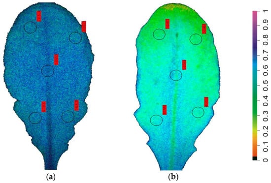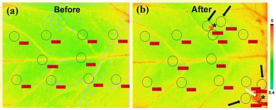 Leaf color-coded pictures in which the color of each pixel represents the level of Fm (maximum chlorophyll a fluorescence in the dark) in tomato leaflets before (a) and after 15 min feeding by Spodoptera exigua larvae (b). The ten areas of interest (AOIs) before feeding are shown by circles in (a), while the same AOIs, together with the two feeding spots (shown by asterisks), and five more AOIs (shown by arrows) were added in (b). The white arrow points a feeding spot which covers the whole AOI. Black arrows point out surrounding zones near the existing AOIs. The circles of AOIs are supplemented by red labels with the Fm value at their location. The color code on the right-side ranges from pixel values 0 to 0.4 (adopted from [104]).
