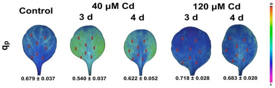 Leaf color-coded pictures of the fraction of open PSII reaction centers (qp) from Noccaea caerulescens plants grown under 0 (control), 40 or 120 µM Cd2+ for 3 and 4 days. A color code on the right-side shows qp values with a range from 0.0 to 1.0 (adopted from [69]).