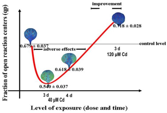The hormetic response of the redox state of quinone A (QA), an estimate of the fraction of open PSII reaction centers (qp), of Noccaea caerulescens plants exposed to cadmium (Cd) stress was induced with 40 µM Cd (Figure 6), due to an increase in ROS generation [33]. A baseline amount of ROS is crucial for sustaining life but under stressful conditions, an elevated level of ROS is regarded as beneficial for initiating defense responses and the acclimation mechanism related to plant stress tolerance [33,34,37,38]. However, an increased level of ROS beyond certain limits can be detrimental to plants [33,34,38,66,148].
