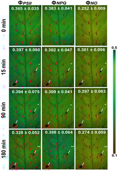 Color-coded pictures of ΦPSΙΙ, ΦNPQ, and ΦNO of a Solanum lycopersicum leaflet before (0 min) and after 15, 90, and 180 min feeding by Spodoptera exigua larvae. The areas of interest (AOIs) before feeding are shown by circles, while the same AOIs, together with the AOIs of the three feeding spots (shown by asterisk and arrows), and the surrounding to feeding zones AOIs are shown. The circles of AOIs are supplemented by red labels with values of the corresponding parameter. The color code on the right side of the images shows pixel values ranging from 0.1 (dark brown) to 0.5 (dark green) (adopted from [104]).