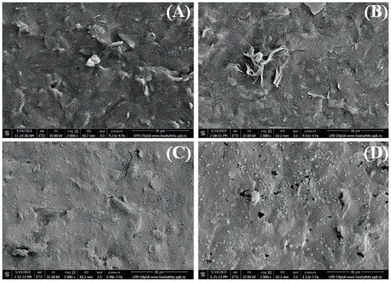 SEM images recorded at 2000× magnification (30 µm scale) for RGO/SPCEs functionalized with AuNPs from (A) 1 mM, (B) 5 mM, (C) 10 mM, and (D) 15 mM HAuCl4 solutions in 0.5 mM H2SO4.
