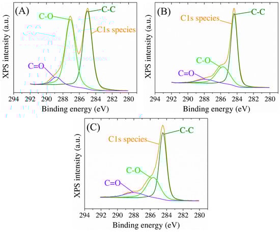 High-resolution C1 XPS spectra of bare SPCE modified with (A) GO, (B) RGO, and (C) AuNPs. The orange curve represents the C1s high-resolution spectrum of GO, RGO, and AuNPs-RGO thin layer, respectively, on the surface of the electrode.