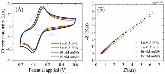 (A) CV and (B) EIS Nyquist plot recorded in 1 mM [Fe(CN)6]3–/4–, 0.1M KCl, for RGO/SPCE functionalized with AuNPs from 1 mM, 5 mM, 10 mM, and 15 mM HAuCl4 solutions in 0.5 mM H2SO4.