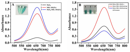 Li, C.; Guo, Z.; Pu, S.; Zhou, C.; Cheng, X.; Zhao, R.; Jia, N. Molybdenum Disulfide-Integrated Iron Organic Framework Hybrid Nanozyme-Based Aptasensor for Colorimetric Detection of Exosomes. Biosensors 2023, 13, 800. https://doi.org/10.3390/bios13080800