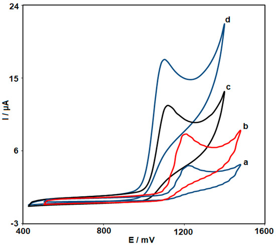 To demonstrate the enhancement effects of NiCo2O4 NPs and HMIM BF4, the electrochemical response of FVP was carried out by cyclic voltammetry (CV) at the different electrodes (Figure 2). Figure 2 shows the CVs of FVP (100.0 μM) at unmodified CPE (Curve a), NiCo2O4 NPs/CPE (Curve b), HMIM BF4/CPE (Curve c), and NiCo2O4 NPs/HMIM BF4/CPE (Curve d). Figure 2 shows the anodic peak potential at 1100 mV for FVP on the NiCo2O4 NPs/HMIM BF4/CPE surface and 1240 mV for FVP oxidation on the unmodified CPE surface (curve a). The graphs show that peak potential FVP oxidation on the NiCo2O4 NPs/HMIM BF4/CPE shifted from 1240 mV to negative values in contrast to the surface of the unmodified CPE. Regarding the FVP oxidation on the surface of NiCo2O4 NPs/CPE (curve b) and NiCo2O4 NPs/HMIM BF4/CPE (curve d), the anodic peak current was enhanced on NiCo2O4 NPs/HMIM BF4/CPE in comparison to NiCo2O4 NPs/CPE, which indicates that the presence of IL in the CPE caused the peak currents to be higher. These results correctly depict the enhancement effects caused by the presence of HMIM BF4 and NiCo2O4 NPs and also amplified the sensitivity of the electrode toward the oxidation of FVP.