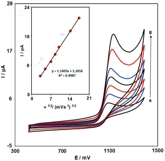 CV responses of 50.0 μM FVP in 0.1 M PBS (pH 7.0) at a scan rate of 10 to 300 mV s−1 at NiCo2O4 NPs/HMIM BF4/CPE (a: 10, b: 25, c: 50, d: 75, e: 100, f: 200, and g: 300 mV s−1). Inset: Plot of the oxidation peak current of FVP vs. v1/2.