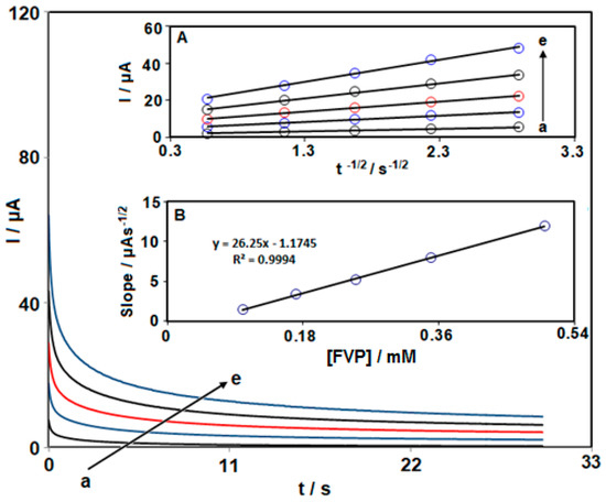 Single-step chronoamperograms obtained at NiCo2O4 NPs/HMIM BF4/CPE at various FVP concentrations (a: 0.1 mM, b: 0.17 mM, c: 0.25 mM, d: 0.35 mM, e: 0.5 mM) in 0.1 M PBS (pH 7.0). Insets: I vs. t−1/2 variation data from the chronoamperograms (A) and slope plot of the straight line vs. concentration of FVP (B).