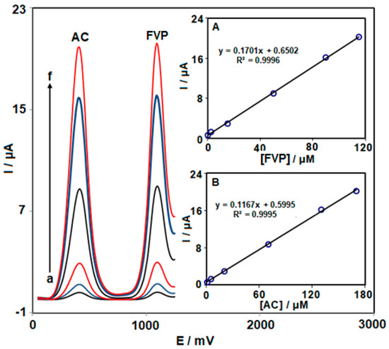 DPV response at NiCo2O4 NPs/HMIM BF4/CPE in 0.1 M PBS (pH = 7.0) with various concentrations of FVP (a: 0.1 µM, b: 2.5 µM, c: 15.0 µM, d: 50.0 µM, e: 90.0 µM, and f: 115.0 µM) and AC (a: 1.0 µM, b: 5.0 µM, c: 20.0 µM, d: 70.0 µM, e: 130.0 µM, and f: 170.0 µM). Insets: The corresponding plots of the anodic peak currents vs. concentrations of FVP (Inset A) and AC (Inset B).