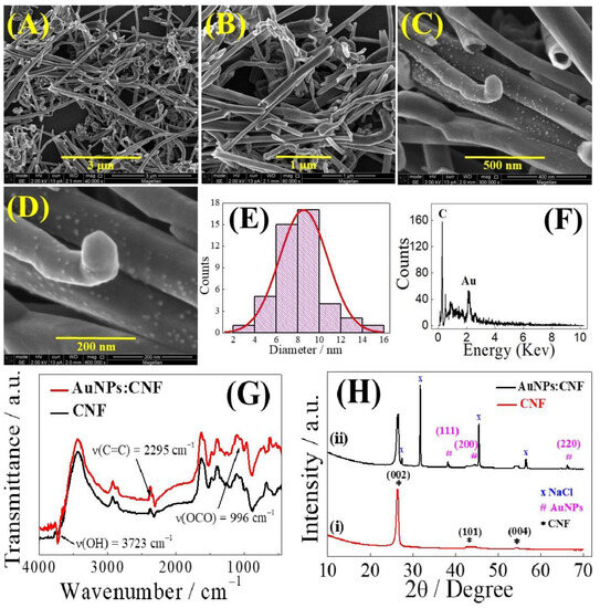 Morphological characterization of CNF and AuNPs:CNF was obtained by scanning electron microscopy (SEM). As seen in Figure 1A,B at different magnitudes, the cylindrical shape of the CNF showed a uniform distribution with varied diameters and lengths. On the other hand, as can be seen in Figure 1C,D, the AuNPs:CNF material showed the same cylindrical shape as the carbon nanofibers but with numerous distributed spherical nanoparticles, showing that there was the incorporation of the AuNPs. The mean diameter of nanoparticles was estimated using ImageJ software. In this way, it was possible to obtain an average value of AuNPs of 8.5 nm (Figure 1E).
