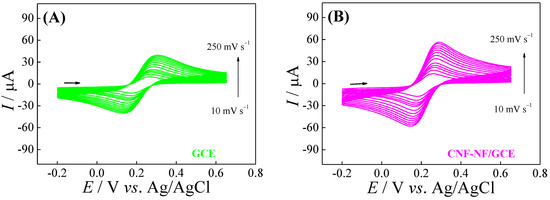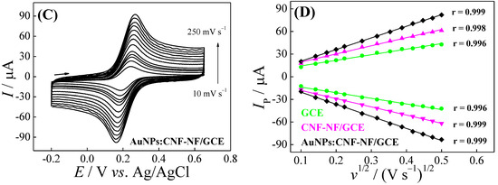The electroactive areas of GCE, CNF-NF/GCE, and AuNPs:CNF-NF/GCE were estimated using the Randles–Sevcik equation (Equation (1)) [27]. For this, cyclic voltammetry (CV) was performed using the redox probe [Fe(CN)6]3− (2.5 mmol L−1) at different potential scan rates (10 − 250 mV s−1) in order to effectively evaluate the electrochemical response of each electrode (Figure 2).