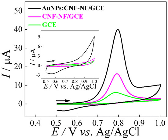 The calculated electroactive areas were 0.052, 0.076, and 0.11 cm2 for GCE, CNF-NF/GCE, and AuNPs:CNF-NF/GCE, respectively. From the results obtained with the electrodes, it can be observed that the modification of the surface of the electrodes increased the electroactive area by two times when comparing the results of the AuNPs:CNF-NF/GCE electrode in relation to the bare GCE and 1.4 times for the CNF-NF/GC.
