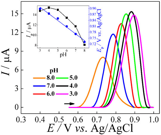 Square-wave voltammetry (SWV) was performed to discover the pH (from 3.0 to 8.0) effect on the NIF (2.0 µmol L−1) oxidation reaction. As observed in Figure 4, the optimal pH of the electrolyte is 4.0, at which the highest magnitude of peak current was obtained.