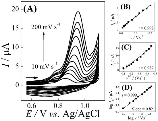 The effect of the potential scan rate was performed using CV, varying from 10 to 200 mV s−1 in the presence of 50.0 µmol L−1 NIF. As seen in Figure 5A, with increasing potential scan rate, there is a change in potential to more positive values (characteristic of irreversible reactions) along with a gradual increase in the magnitude of the peak current. Furthermore, the results showed good linearity in the relationship of ΔIpa vs. v (Figure 5B) when compared with ΔIpa vs. v1/2 (Figure 5C), indicating that NIF oxidation is controlled by adsorption on AuNPs:CNF-NF/GCE. This process is proved by the relationship between log ΔIp vs. log v (Figure 5D), which presented a slope of 0.821, closer to the theoretical value of 1.0, and characteristic of an adsorption-controlled system.