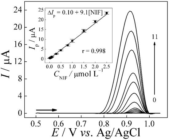 Figure 6. SW voltammograms obtained using the AuNPs:CNF-NF/GCE sensor in 0.10 mol L−1 phosphate solution (pH 4.0) containing different concentrations for NIF: (0–11) 0, 0.020, 0.050, 0.080, 0.10, 0.30, 0.50, 0.80, 1.0, 1.5, 2.0, and 2.5 µmol L−1. Insert: analytical curve. SWV parameters: a = 60 mV, f = 30 Hz, ΔEs = 7 mV, and tacc = 30 s. The arrows indicate the scan direction.