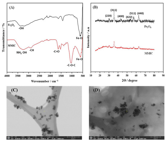 FTIR spectra (A) and XRD diffractograms (B) of Fe3O4 and MMIC. (C,D) TEM images of Fe3O4 and MMIC, respectively.