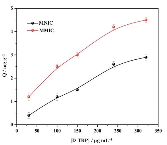 The binding isotherms of D-TRP on the MMIC and MNIC at 25 °C are presented in Figure 3. As the concentration of D-TRP increased, both the MMIC and MNIC demonstrated higher binding capacities. However, due to the presence of multiple cavities, the MMIC exhibited a higher adsorption capacity compared with the MNIC. This observation was supported by the higher values of the imprinted factor, which represents the ratio of the adsorption capacity of MMIC to MNIC. The imprinted factor values ranged between 1.5 and 2, providing further evidence for the successful development of D-TRP cavities on the surface of the MMIC.
