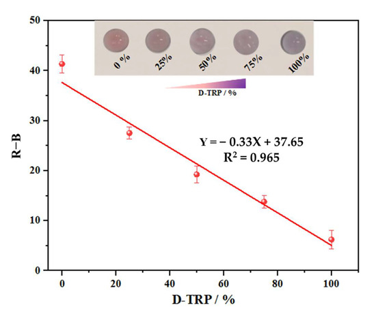 An interesting observation is related to the change in color from red to purple, which is dependent on the enantiomeric ratio. Figure 6 illustrates that the aggregation of AuNPs was selectively induced by D-TRP, leading to the precipitation of D-TRP with AuNPs. As a result, the excess of the other enantiomer remained in the solution, thereby enabling enantioseparation. The graph in Figure 6 demonstrates a linear decrease in the R-B intensity with an increasing enantiomeric percentage of D-TRP, ranging from 0% to 100%, indicating the optimized assay’s ability to quantify the enantiomeric composition accurately.