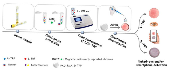 In this work, a magnetic molecularly imprinted chitosan (MMIC) was developed for the extraction of TRP and combined with a PAD for to discriminate between the enantiomers of TRP. The proposed PAD was based on a nitrocellulose membrane modified with D-TRP-grafted polymethacrylic acid (PMA_D-TRP), successfully leading to good chiral separation using AuNPs as a colorimetric probe. The developed procedure holds promise for applications in pharmaceutical analysis, offering a reliable and user-friendly approach for chiral analysis.