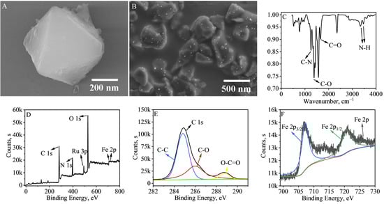 SEM images of (A) MIL-88B(Fe)-NH2@Ru(bpy)32+, and (B) NH2-Biochar-Au. (C) FT-IR spectrum of MIL-88B(Fe)-NH2@Ru(bpy)32+. (D) XPS spectra of MIL-88B(Fe)-NH2@Ru(bpy)32+, (E) C 1s and (F) Fe 2p.