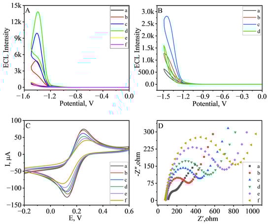 (A) ECL responses of (a) GCE, (b) GCE/MIL-88B(Fe)-NH2@Ru(bpy)32+, (c) GCE/NH2-Biochar/MIL-88B(Fe)-NH2@Ru(bpy)32+, and (d) GCE/NH2-Biochar-Au/MIL-88B(Fe)-NH2@Ru(bpy)32+ (in PBS containing 90 mmol·L−1 K2S2O8). ECL responses of (e) GCE/MIL-88B(Fe)-NH2, (f) GCE/NH2-Biochar-Au (in PBS). (B) ECL responses of (a) GCE, (b) GCE/NH2-Biochar, (c) GCE/NH2-Biochar-Au, and (d) GCE/MIL-88B(Fe)-NH2 (in PBS containing 90 mmol·L−1 K2S2O8). (C) Cyclic Voltammetry Results (in 5 mM Fe(CN)63− and 0.1 M KNO3) and (D) Electrochemical Impedance Spectroscopy Results (in 2.5 mM Fe(CN)63−/4− and 0.1 M KCl) of (a) bare GCE, (b) GCE/NH2-Biochar-Au, (c) GCE/NH2-Biochar-Au/Ab1, (d) GCE/NH2-Biochar-Au/Ab1/BSA, (e) GCE/NH2-Biochar-Au/Ab1/BSA/AFB1, and (f) GCE/NH2-Biochar-Au/Ab1/BSA/AFB1/MIL-88B(Fe)-NH2@Ru(bpy)32+-Ab2-BSA. The concentration of AFB1 used for the test was 50 ng·mL−1.