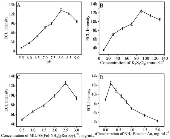 Effects of (A) pH, (B) concentration of K2S2O8, (C) concentration of MIL-88B(Fe)-NH2@Ru(bpy)32+, and (D) concentration of NH2-Biochar-Au on the ECL response.