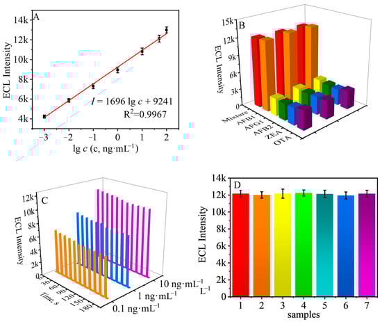 To verify the performance of the designed immunosensor, the analytical performance of the immunosensor was firstly investigated under the above optimal experimental conditions. The results are shown in Figure 4A. The obtained ECL signal was positively correlated with the logarithm of AFB1 concentration and was able to achieve sensitive detection of AFB1 in the range of 1 pg·mL−1~100 ng·mL−1. The regression equation of the obtained fitted curve was I = 9241 + 1696 log c, where I is the ECL intensity, c is the concentration of AFB1, and R2 = 0.9967. We also prepared a batch of signal probes without AFB1, and the detection limit of the immunosensor was calculated to be 209 fg·mL−1 after testing.
